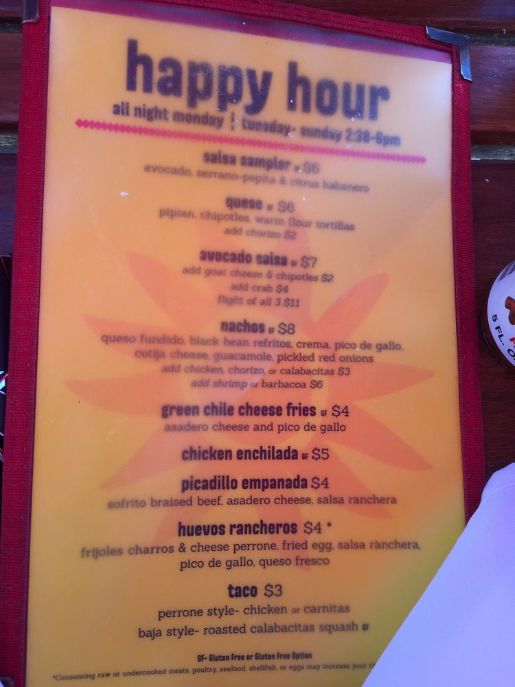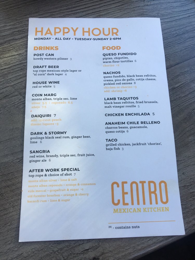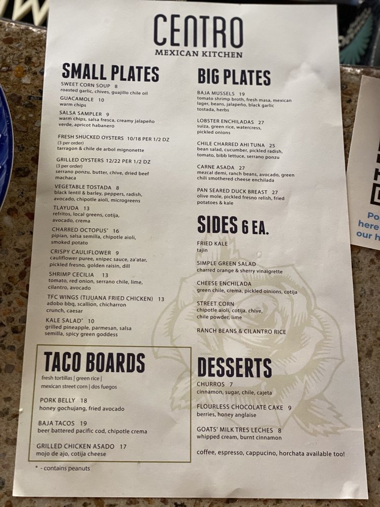 “ Like every place I've been recently, they are a little understaffed. It's reality in these times, especially as CU students, who often work as service workers in Boulder, are away on spring break. But a nice helpful bartender stepped up to help us and the line building behind us, to get us seated. Friday is all day happy hour at Centro and customers flocking up and down the west end of Pearl were stopping in. My husband finally got to try the El Corn Beer from Post Brewing as it had been out of stock at another of the group's restaurants a while back. Just right for him. We started with the guacamole and chips and we were excited to see such a new iteration. Chunky avocado with a variety of seeds and spices as well traditional ingredients of red onion and jalapeño. The black and white sesame seeds and popped garbanzo add a great crunch. The chips were house sliced and fried corn tortillas, wide strips, not triangular wedges. They picked up the heavier concoction without breaking. Very appreciated. I should have taken a pic before we ate it right up. We next had the fish taco board. Nice to get a choice of grilled as I am "fried" limited. They have switched out the cilantro green rice for a more standard red Spanish rice though deconstructed with sauce on top of white rice. It was good anyway but I wish they retained the cilantro style as a choice too. It's my favorite herb of this cuisine. The corn tortillas were warm and fresh and the slaw as good as ever. Always a nice time here and with it just warm enough in the patio now, I love the better natural light out there. As vision impaired, low lighting can lead to menu and plate issues. Our server was very friendly juggling many customers including a party (literally) if 8 nearby. Definitely worthy of another trip later this spring. ”